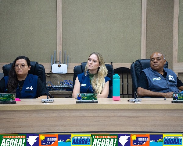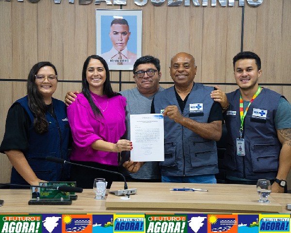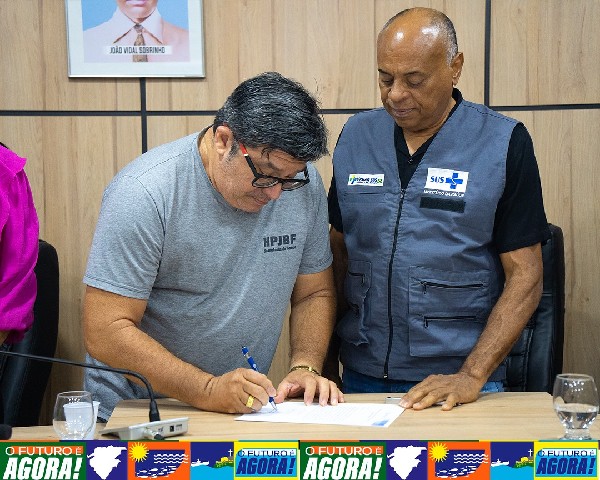 #ParaTodosVerem: Imagem mostrando o momento da assinatura do termo na Câmara Municipal, com representantes da Secretaria de Saúde e do Governo do Estado presentes no local.