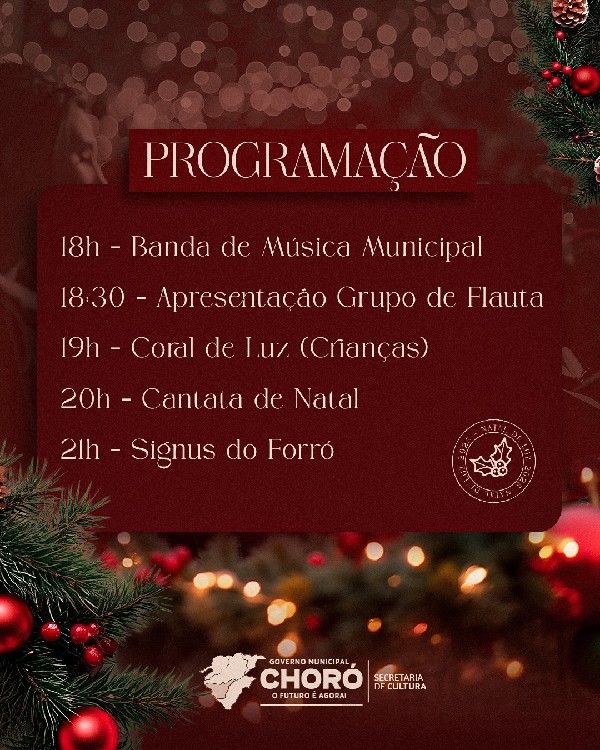 Choró vai viver uma noite especial, cheia de luz, emoção e encanto com a Cantata de Natal. Um momento preparado com carinho para reunir famílias, celebrar o verdadeiro espírito natalino e encher a Praça Central de música, fé e alegria.
