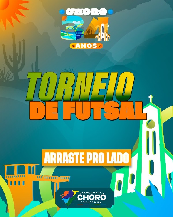 Dentro da programação especial pelos 34 anos de Choró, vem aí o Torneio de Futsal, reunindo atletas e muita emoção nas quadras do nosso município. Prepare a torcida e venha prestigiar esse grande momento do esporte choroense