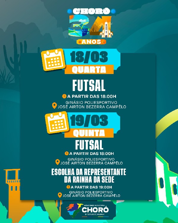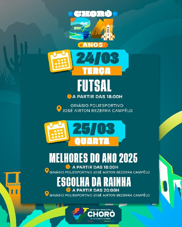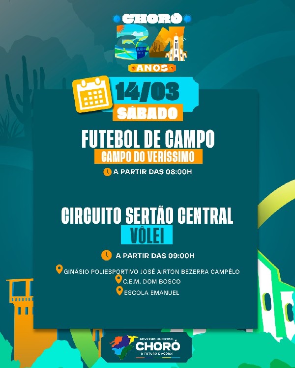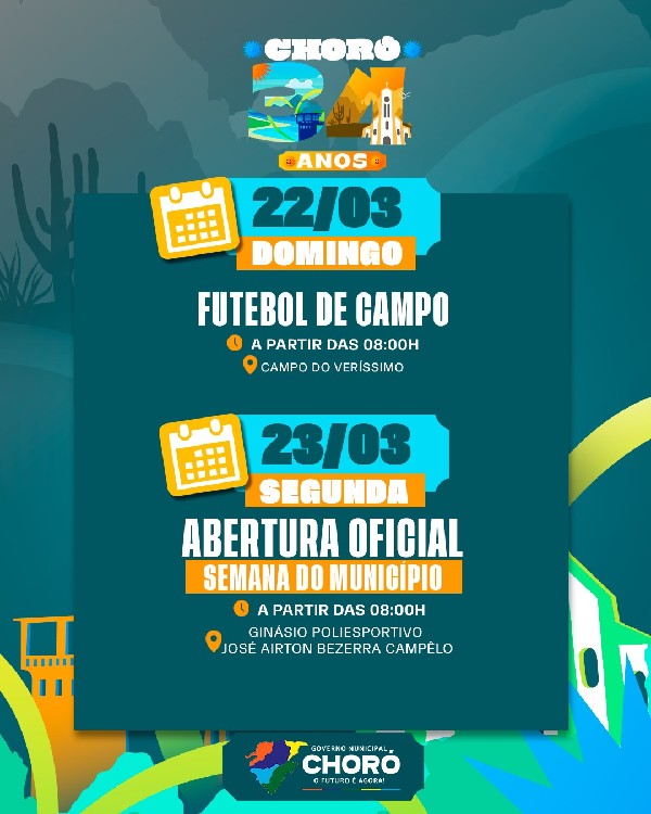 O aniversário de 34 anos de Choró será comemorado com uma programação especial preparada para todo o mês, reunindo cultura, esporte, ações sociais, inaugurações e muita celebração para a nossa população.